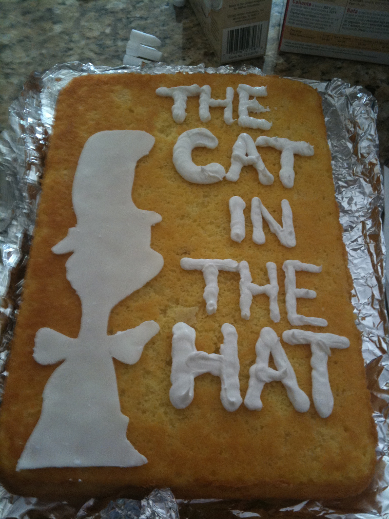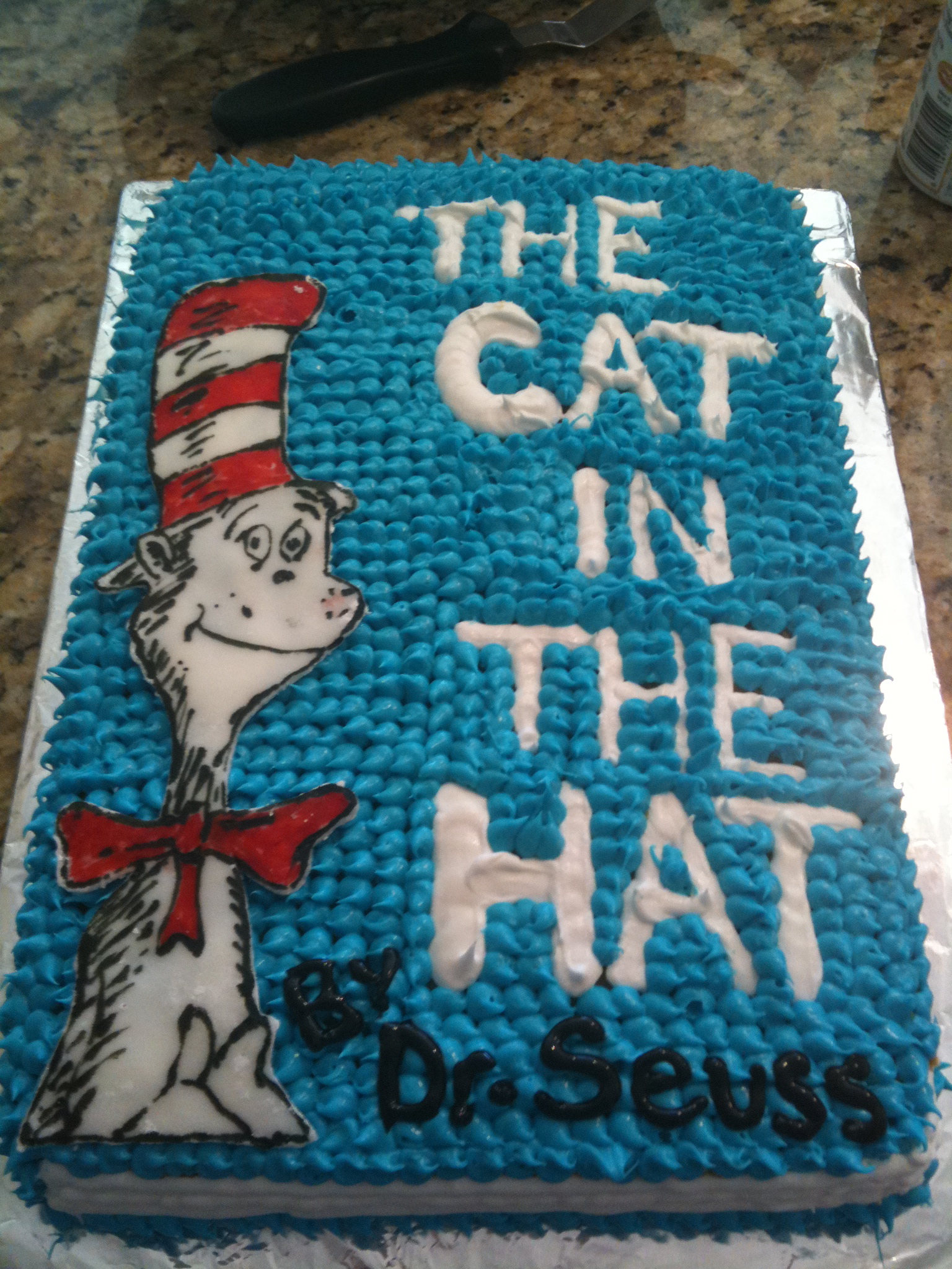The Cat in the Hat Sheet cake is just a Vanilla Cake from a box. Hopefully, after my Pastry Class this Fall I will be confident enough to make my cakes from scratch.