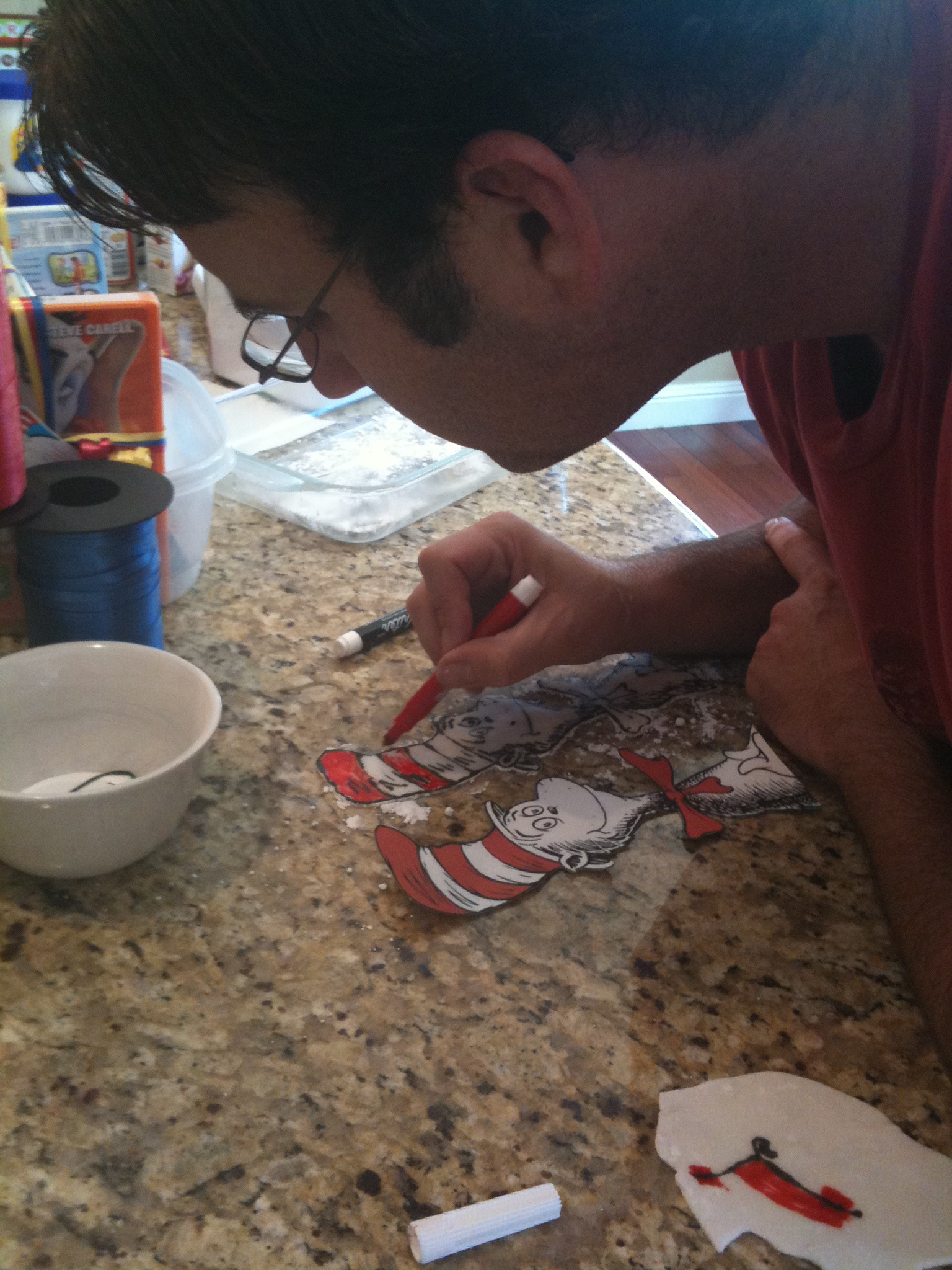 After finding the perfect Cat in the Hat picture online, I used white fondant to trace & cut the image. Luckily, my husband has the “artsy gene” and can draw pretty well. He used Food Markers (like the ones you use to draw on cookies) and was able to copy the image onto the fondant. AMAZING if you ask me 🙂 Well done honey!