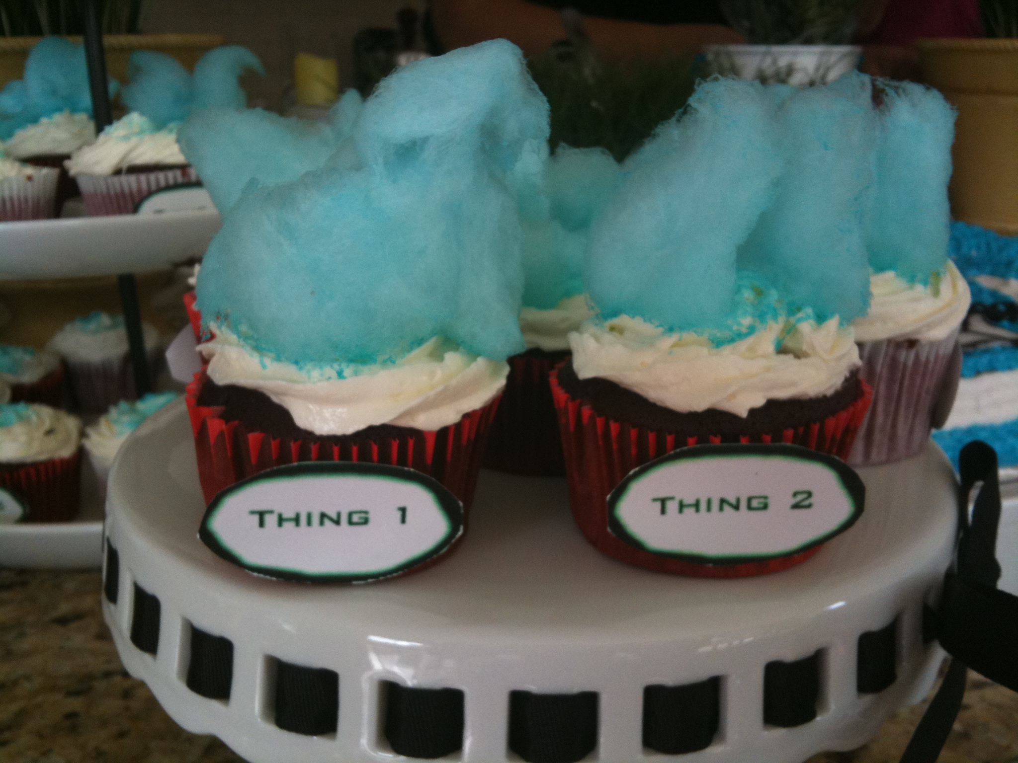 Once the cupcakes were baked & iced, I placed blue cotton candy on the top to look like Thing 1 & Thing 2 hair.
