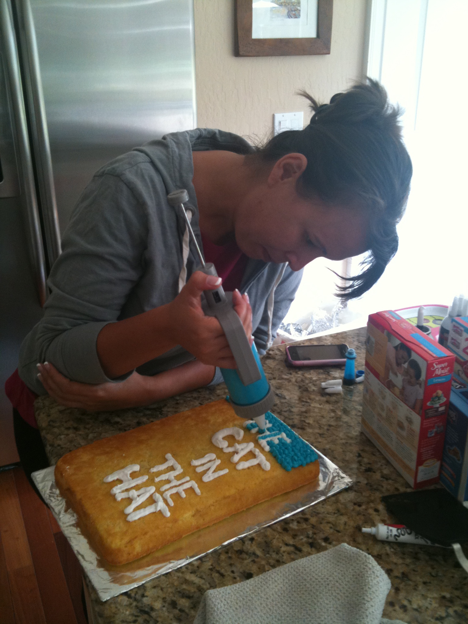 From there… Let the piping begin. About a billion blue icing dots were added around the words. Once the entire cake was covered, the Cat in the Hat image was placed onto of the blue icing dots.