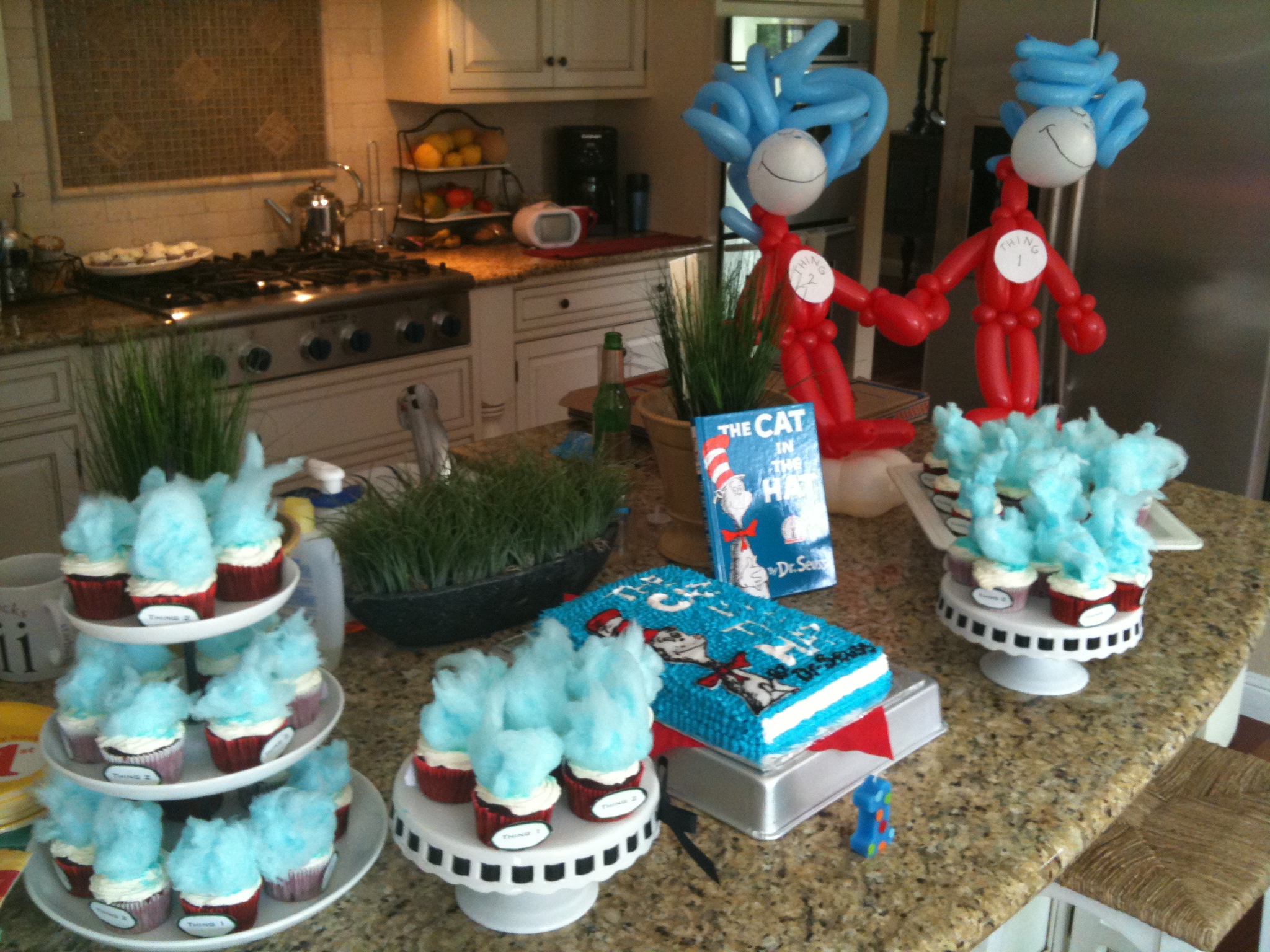 Since I didn’t have to put too much effort into the decorations, I mainly focused on the cake & cupcakes. Cat in the Hat Sheet Cake and Thing 1 & Thing 2 Cupcakes