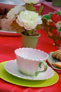 Red Table Cloth, Flowers, bowls of jelly beans, and Flower tea cups (which were their favors) were all set out on the table. Homemade pinwheels stood in clear vases with dried black beans.