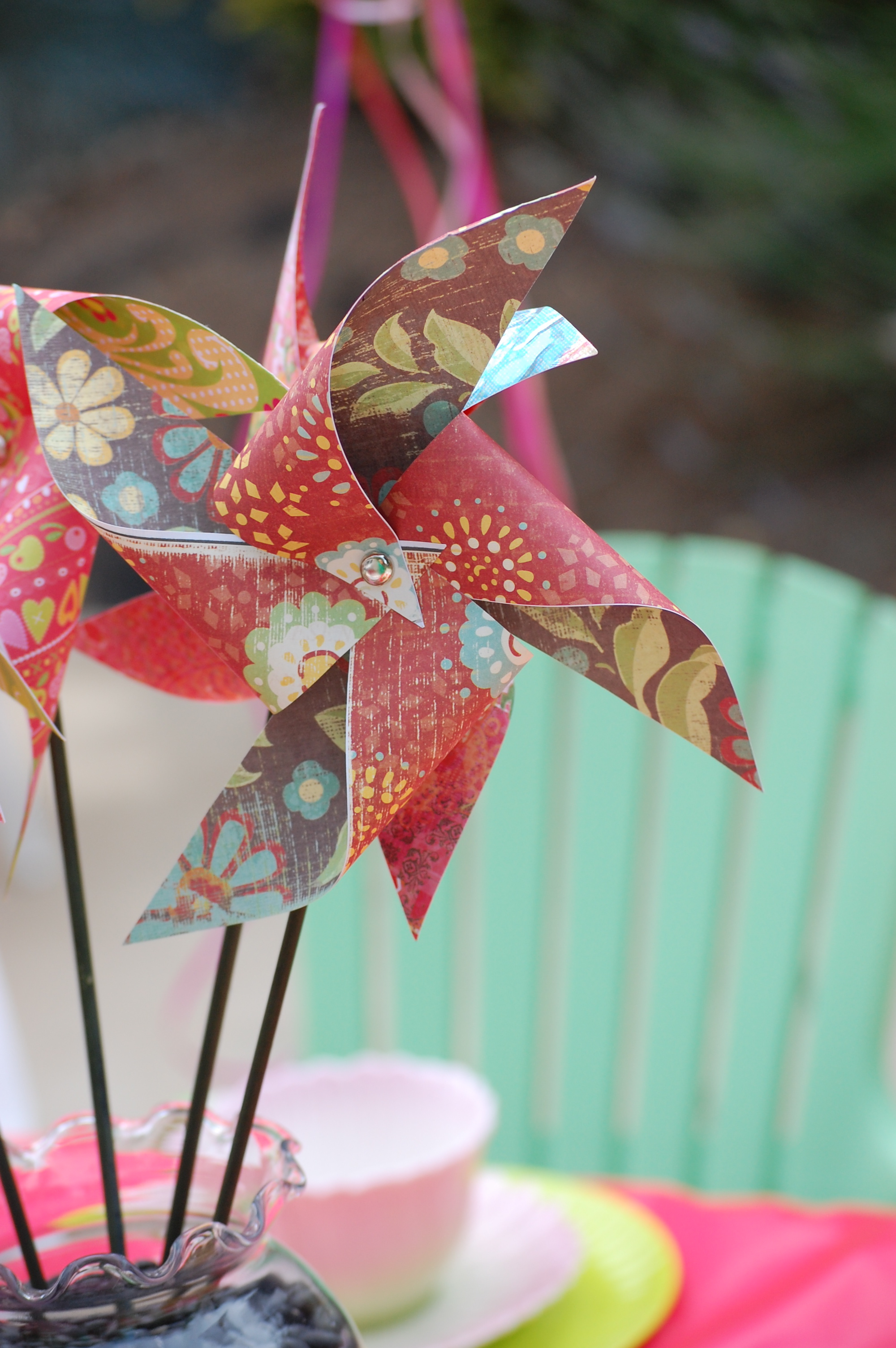 Put a paper brad in each of the corner holes, then pull up and insert into center hole. Fasten brad, glue to a stick & there you go! You now have your very own Homemade Pinwheel.