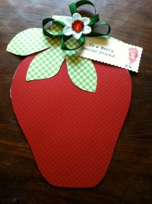 To make the strawberry shape, I just searched online for one I liked, enlarged it to the size I wanted, then cut out a template. The template was then used to trace the strawberry shape on the red & white card stock.