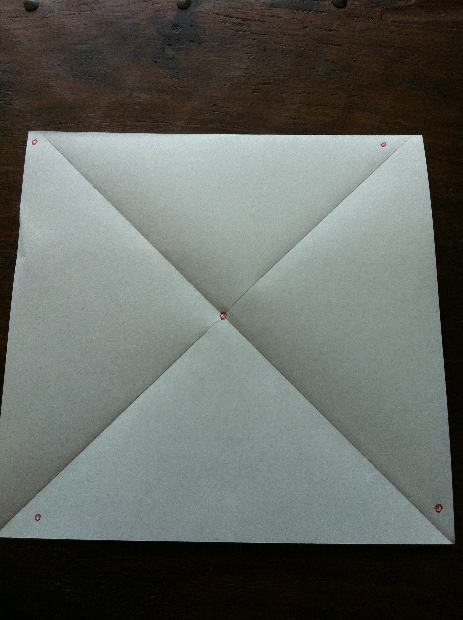 From there, fold 1 corner diagonally making a triangle. Unfold & do it again the opposite way (see picture below). Cut along folded lines 3/4 of the way up (DO NOT cut all the way to the middle). Punch a hole in the center & on the same side of each square corner.