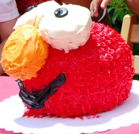 The eyes & nose are large cupcakes, which are attached to the head with wooden kabob skewers. Ice everything up with Elmo colored icing & you have yourself an edible Elmo head.